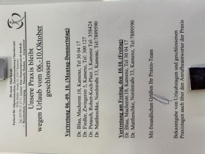 Einzeln geschlossene Praxistage ,unsere Urlaubszeit und die Vertretungs-Praxen werden vom Anrufbeantworter unserer Praxis bekanntgegeben und wurden ärztlicherseits persönlich abgesprochen (03578-312151).